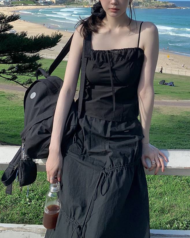 얇은 끈으로 연결된 슬리브리스 블라우스에 볼륨감 있는 롱스커트를 매치해, 몸에 딱 붙지도 과하게 흐르지도 않는 자연스러운 실루엣을 완성했어요.
