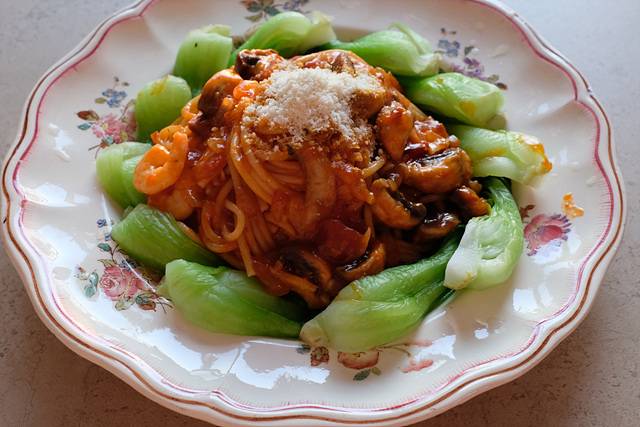 실패없는 토마토소스 스파게티에 청경채가 싸게 팔길래 같이..
