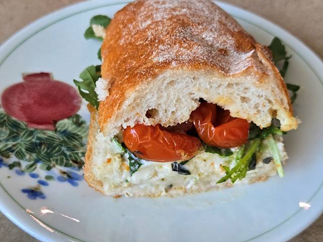 방울토마토 콩피 + 부라타치즈 + 루꼴라 + 바질페스토를 곁들인 치아바타 샌드위치. 어제 먹은 거네요.
