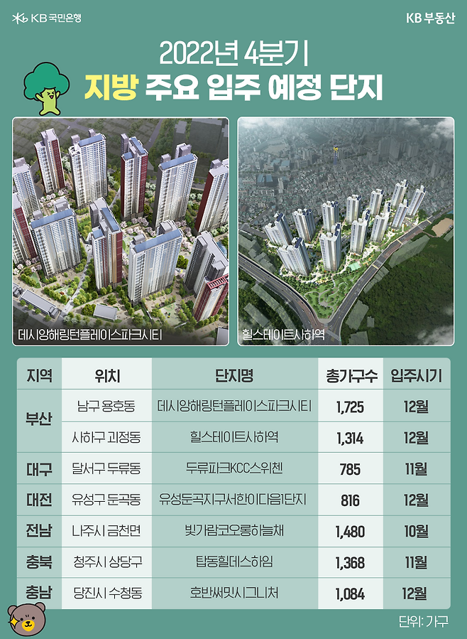 지금까지 2022년 4분기 전국 입주 물량과 단지를 살펴 봤습니다. 최근 매수 심리가 위축되면서 전국의 집값이 하락세로 돌아섰는데요. 대규모 입주를 앞두고 있는 곳은 역전세난 현상이 빚어지면서 하락세가 가속화될 가능성도 우려도 나오고 있습니다. KB부동산 앱과 데이터허브를 통해 자신의 조건에 맞는 집을 찾는데 도움이 되길 바랍니다.