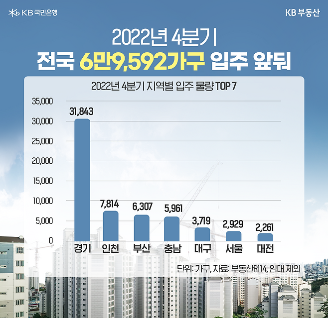 부동산R114 자료에 따르면, 2022년 4분기 전국 입주 물량은 6만9,592가구(임대 제외)인 것으로 조사됐습니다.