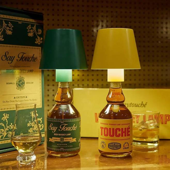 위스키 덕후에게 선물하기 좋은 인테리어 소품을 소개한다. 감각적인 디자인 소품을 만드는 세이투셰(https://tinyurl.com/24ar67xj)의 조명이다. 위스키 병 안에 실제 액체가 들어있고 그 위에 전등 갓이 씌워져있다. 흔들면 찰랑거리는 갈색 액체가 보여 진짜 위스키라고 착각할 만하다. 전구색, 주광색, 주백색 3가지 컬러 중에 고를 수 있고 충전해서 사용하는 방식이다. 가격은 8만 9,000원. 위스키병 컬러는 옐로우와 그린 두 가지다.