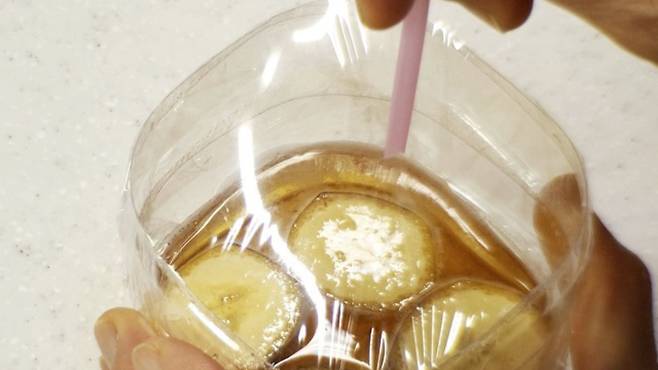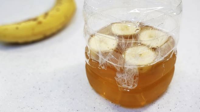 페트병 안에 잘라 놓은 바나나를 넣으세요. 그리고 맥주를 부어 줍니다. 이때 맥주는 김이 빠져도 상관 없으니 남은 맥주가 있다면 그것으로 부어 주세요.
