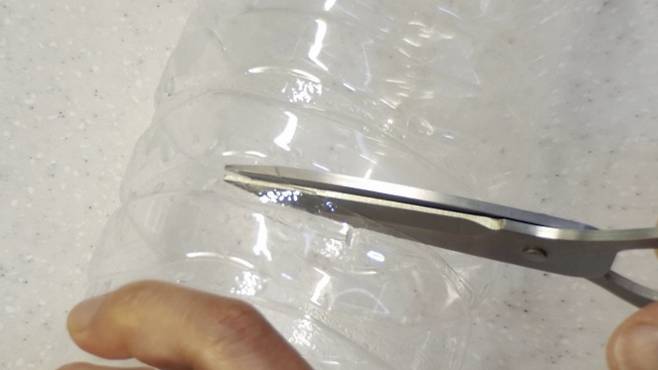 이제 트랩을 만들 페트병 하나를 준비하세요. 그리고 중간 부분을 잘라 줍니다. 이때 가위나 칼을 이용해서 잘라 주세요.