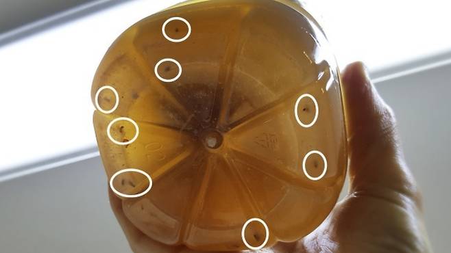 짜잔 실제로 1주일 정도 보관한 초파리 트랩이에요. 곳곳에 초파리가 죽어서 가라앉아 있는 것을 볼 수 있어요. 효과는 정말 좋답니다. 만약 생긴 초파리를 잡고 싶다면 한번 만들어 놓고 1주일 정도 두는 것이 좋은 것 같아요.