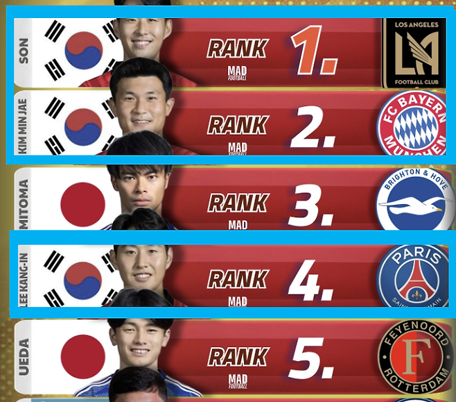 1위에 대한민국 축구 대표팀 주장 손흥민(LAFC), 2위에 '괴물 수비수' 김민재(바이에른 뮌헨)가 오른 것을 비롯해 4위에 골든보이 이강인(PSG)이 포함됐다.