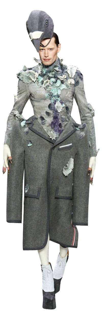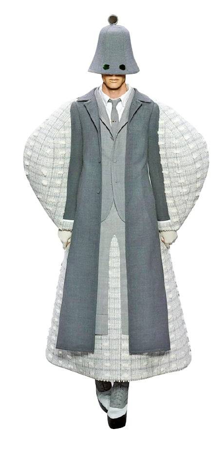 톰 브라운에게 오트 쿠튀르는 꿈의 무대와도 같았다. ‘고급’을 뜻하는 오트, ‘바느질’을 의미하는 쿠튀르라는 어원에 맞게 이 쇼에 오르는 의상 한 벌을 제작하는 데 적어도 100시간이 걸린다고. 쇼 참가 신청을 위해서는 브랜드의 예술성, 창의성, 장인정신을 담은 고급 공정 과정은 물론 모든 컬렉션이 무조건 ‘핸드 메이드’로 제작돼야 한다는 조건이 붙는다. 이 까다로운 벽을 넘은 톰 브라운은 그의 디자인 철학처럼 다시 오지 않을 패션쇼 무대를 ‘자신의 모든 것을 보여줄 연극 무대’처럼 꾸미기로 했다. 가장 먼저 등장하는 방랑자, 웩이 입고 있는 회색 재킷은 톰 브라운의 가장 초창기 재킷 모델이다. 대중에게 ‘톰 브라운 성공의 시작’으로 불린다.