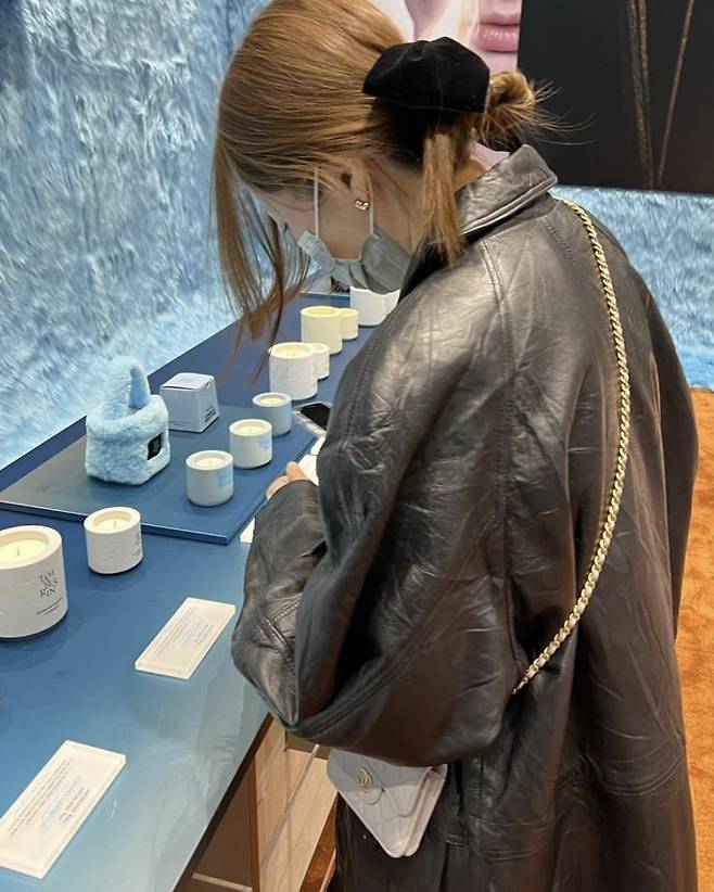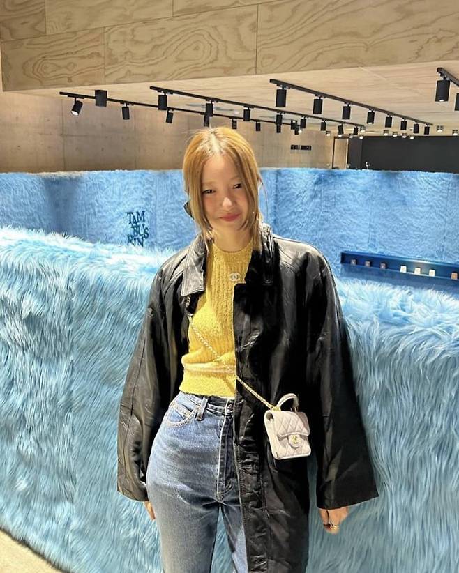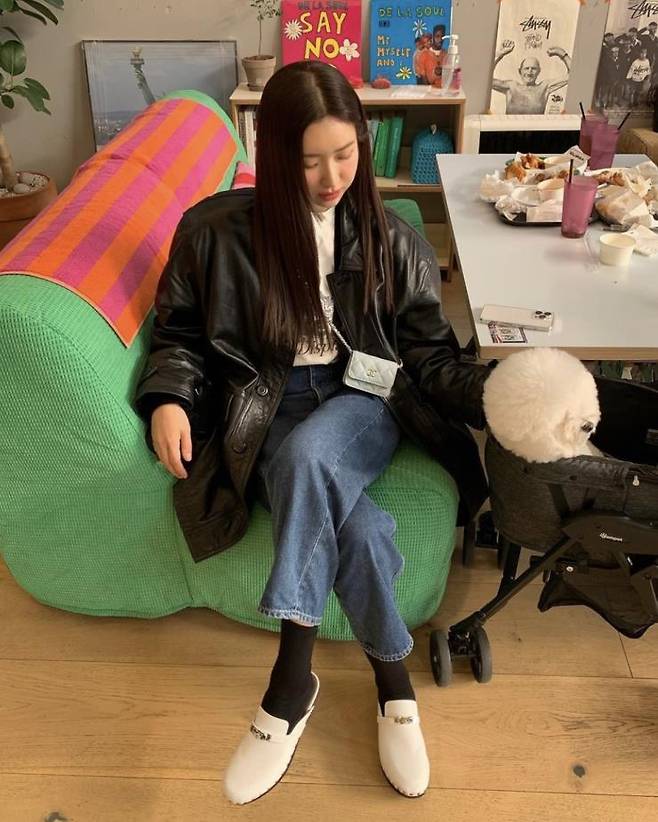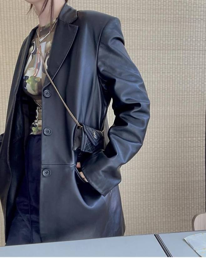 수사샤는 포멀한 형태의 레더 재킷을 입었어요. 이너로 프린팅이 화려한 탑을 매치해 힙하게 연출했습니다. 미니 크로스백으로 귀여운 포인트를 줬습니다.