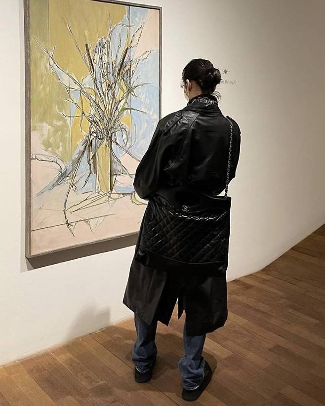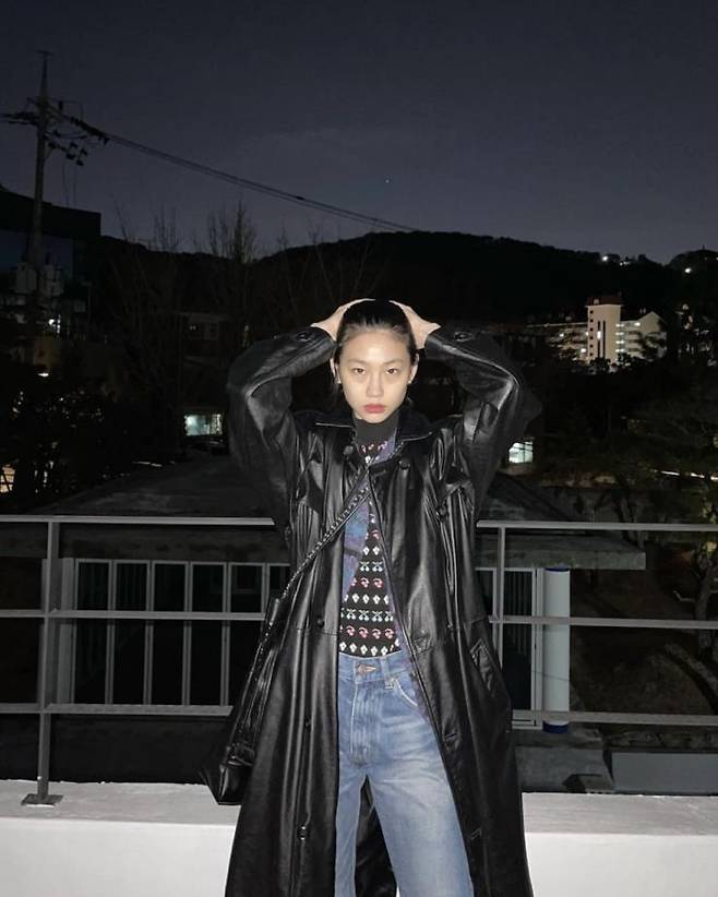 정호연은 레더 트렌치코트를 입었습니다. 여기에 큼지막한 샤넬 백을 멨네요. 도전하기 쉽지 않은 레더트렌치 코트지만, 모델다운 소화력을 보여주네요.