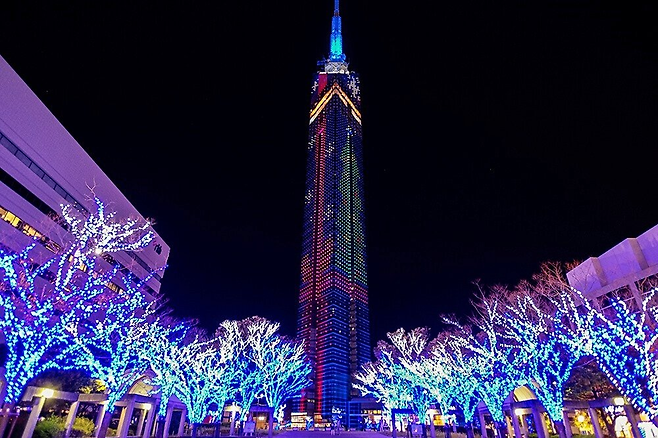 후쿠오카타워는 시사이드 모모치 해변 공원 근처에 위치한 후쿠오카의 대표적인 명소 중 하나에요. 연말이 되면 마법 같은 크리스마스 트리로 변신해요. 높이 108미터의 거대한 타워가 8가지 색상으로 빛나며, 1분 30초마다 색상이 변하는 멋진 광경을 즐길 수 있답니다.