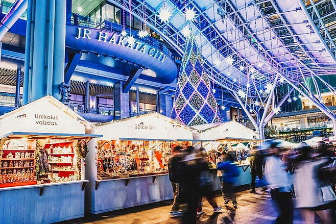 하카타역은 후쿠오카의 중심이자 다양한 교통수단이 연결되는 중요한 역이에요. 연말이 되면 하카타역 앞 광장도 화려한 일루미네이션과 크리스마스 장식으로 가득 차게 된답니다. 크리스마스 시즌에는 이곳에서 크리스마스 소품과 기념품을 판매하는 작은 마켓도 열려, 여행자들에게 특별한 재미를 선사해줘요.