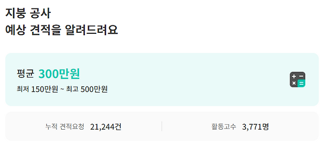 숨고 내에서 거래되는 지붕 공사 평균 비용은 건당 300만 원입니다. 최저 비용은 150만 원, 최고 비용은 500만 원으로 책정되어 있어요.