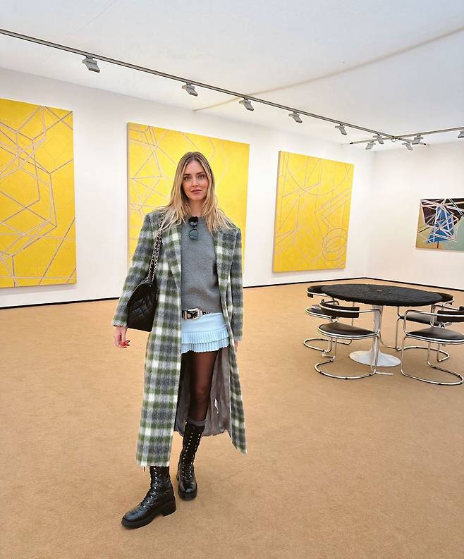 파스텔톤 러플 미니스커트에 그레이 풀오버를 매치한 뒤 스터드 장식 벨트와 와일드한 컴뱃 부츠를 더해 트렌디한 감각을 표현한 키아라 페라그니는 체크를 반전 이미지로 활용했다. 데 펨메스의 맥시한 타탄 체크 코트를 레이어링해 클래식하면서 이지적인 분위기로 단숨에 탈바꿈한 것.