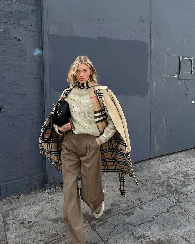 체크하면 떠오르는 절대 강자는 역시 버버리! 트레디셔널 체크가 눈길을 사로잡는 버버리의 후드 코트에 체크 캐시미어 머플러를 레이어링해 클래식한 매력을 한층 배가시킨 엘사 호스크. 배기 실루엣의 테일러드 팬츠는 매니시한 분위기를 더해주는 히든 아이템이다.