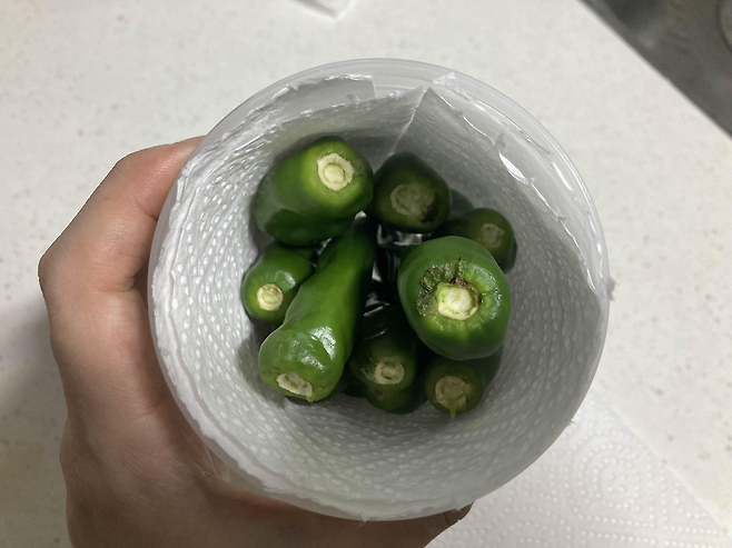 고추에 묻은 물기를 키친타월을