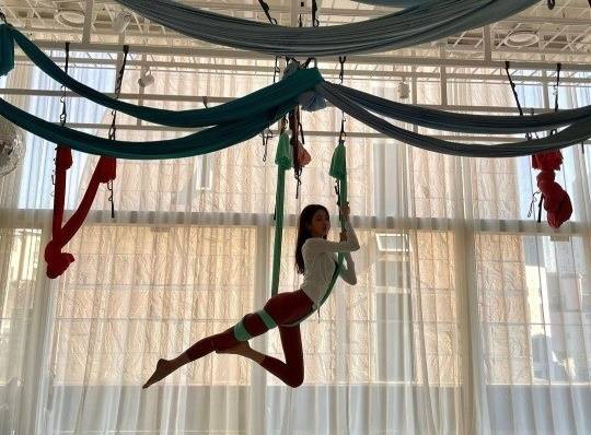쭉쭉 뻗은 팔다리로 여유롭게 해먹을 휘감은 그는 고난이도 동작까지 편안하게 해냈는데요. 레깅스 패션에서 엿보이는 군살 하나 없는 매끈한 몸매와 남다른 유연성이 시선을 사로잡습니다.