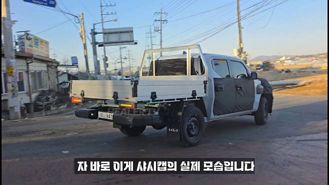 기아 타스만(Tasman)의 다양한 적재함 형태 중 섀시캡(Chassis Cab) 모델의 실물 모습이 힐러티비 채널에 포착되어 이목을 끌고 있다. 섀시캡 모델은 일반적인 픽업트럭과는 다른 독특한 외형을 지니고 있는데, 앞모습은 기존에 공개된 픽업트럭 모델과 동일하지만 뒷부분은 적재함이 없는 형태로, 사용 목적에 따라 다양한 형태로 변형이 가능하다는 특징을 지닌다.