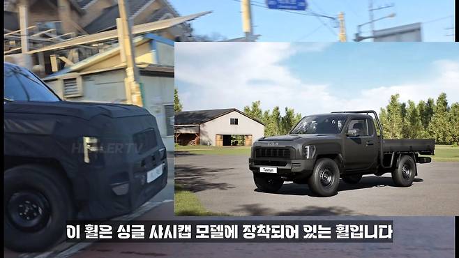 전면부 디자인은 이전에 공개되었던 타스만 2.2 디젤 모델과 동일한 모습을 보여준다. 측면에서 눈에 띄는 것은 휠 디자인인데, 싱글 섀시캡 모델에 장착되는 휠이 포착된 더블 섀시캡 모델에 적용된 것을 확인할 수 있다.