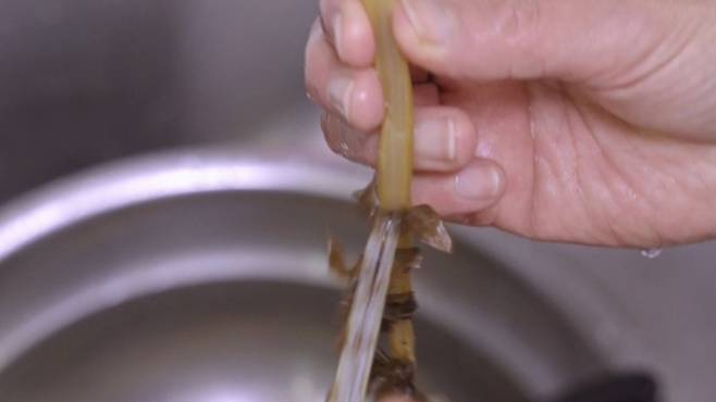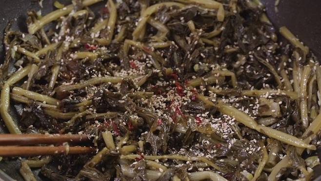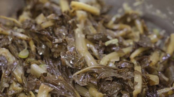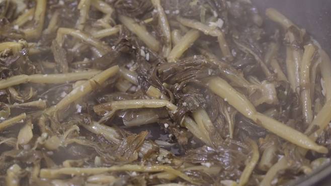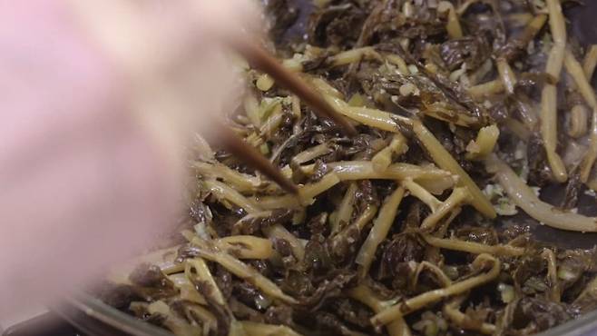 10분이 지나면 후라이팬에 시래기를 넣으세요. 그리고 중불에서 계속 볶으세요.