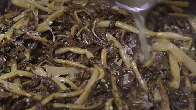 어느 정도 시래기가 볶아졌다 싶으면, 이때 다시마국물과 소금을 넣고 섞어 주세요. 이때 일반 물이 아닌 다시마 육수를 넣기 때문에 더욱 감칠맛이 살아납니다. 그리고 별다른 재료 없이도 훨씬 맛있는 시래기볶음을 맛볼 수 있어요.