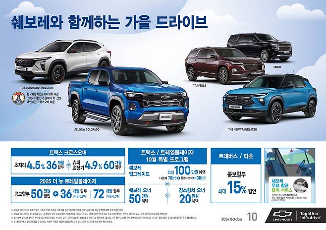 [M투데이 임헌섭 기자] 글로벌 브랜드 쉐보레(Chevrolet)가 본격적인 가을에 앞서 10월, '쉐보레와 함께하는 가을 드라이브' 프로모션을 실시하며 국내 고객들에게 풍성한 혜택을 제공한다.