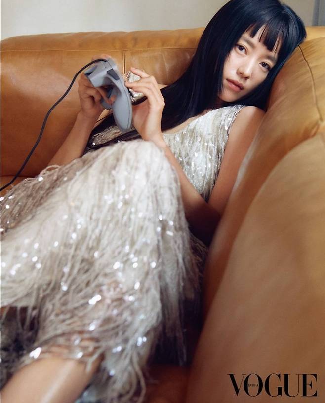 긴 히피뱅 스타일의 블랙 헤어에 반짝이는 프린지 드레스, 그리고 손에 쥔 게임 컨트롤러까지 어우러져 현실과 가상의 경계를 허문 독창적인 스타일링이 완성됐습니다.