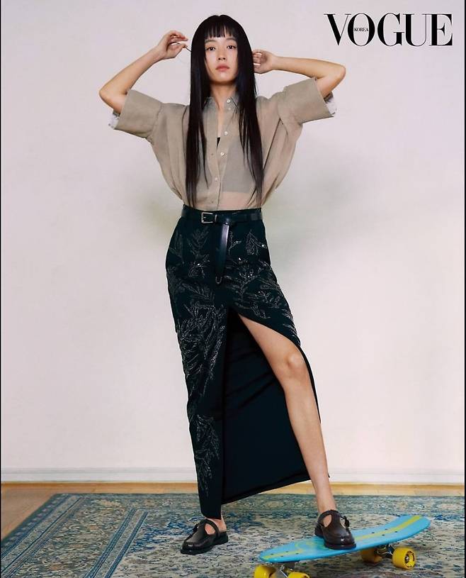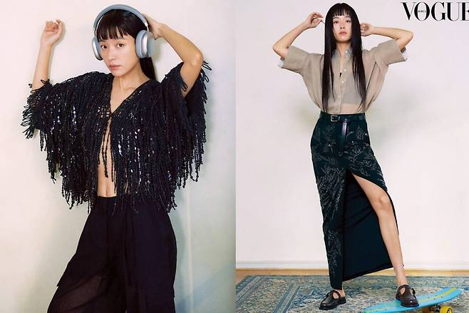 아이보리 슈트에 빈티지한 라벨 벨트 포인트를 준 룩도 남다른 아우라를 발산하며, 블랙 프린지 크롭톱과 시스루 롱스커트 스타일링으로 압도적인 감각을 보여줬습니다.