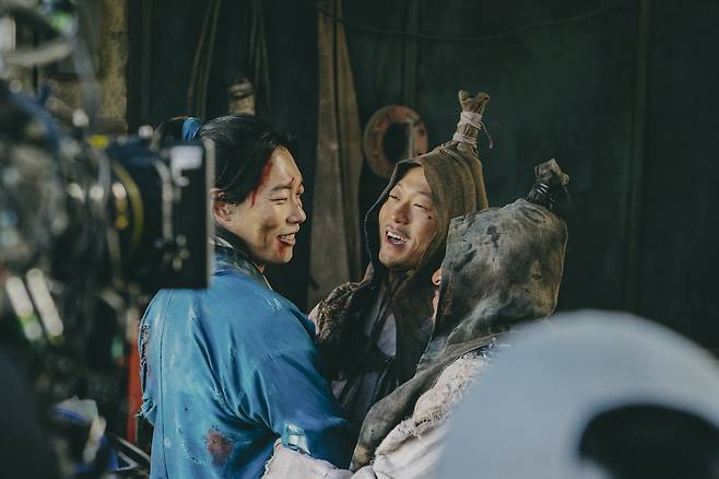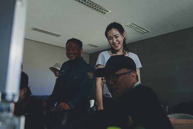 더불어 최동훈 감독과 함께 모니터링하고 있는 민개인 역의 이하늬, 카메라 너머에서도 완벽한 호흡을 선보이는 흑설 역의 염정아, 청운 역의 조우진의 장난스러운 모습은 현장의 분위기를 짐작케 한다.