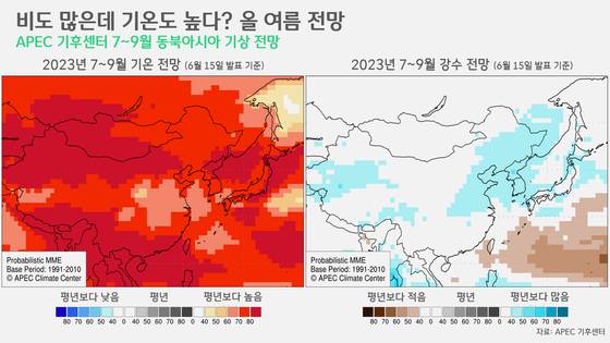 APEC 기후센터는 1만km 넘게 떨어진 엘니뇨·라니냐 감시 수역의 해수온뿐 아니라 인근의 여러 변수를 종합해 7~9월 동북아시아 지역의 기상 전망을 내놨습니다. 당장 동북아 지역 전체적으로, 이 기간 기온은 평년보다 훨씬 높을 것으로 전망됐습니다. 더위는 '디폴트'로 갖고 가는 겁니다. 반면, 강수는 곳에 따라 예측이 엇갈렸습니다. 비가 평년 수준으로 내릴 곳도, 평년보다 적게 올 곳도, 평년보다 더 내릴 곳도 있었죠. 한반도는 평년보다 더 많은 비가 예상됐습니다. 더위와 비 모두의 영향을 받는 몇 안 되는 지역 중 하나가 된 겁니다.