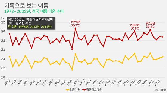 전국 단위의 관측이 본격화한 1973년 이래로 지난 50년간의 여름 기온을 살펴봤습니다. 해마다 '헉헉대는 더위'에 30℃는 가뿐히 넘었었던 것 같은데, 기록은 기억과는 사뭇 달랐습니다. 50번의 여름 가운데 평균 최고기온이 30℃를 넘어선 것은 불과 3번뿐이었습니다. 1994년과 2013년, 그리고 2018년이었죠. 소위 '역대급 더위'로 기록된 해였습니다. 1994년, 여름철 평균 최고기온은 30.7℃에 달했습니다. 두 번째로 더운 여름은 2018년으로, 평균 최고기온은 30.4℃를 기록했고, 2013년도 30.1℃로 30℃를 넘었습니다.