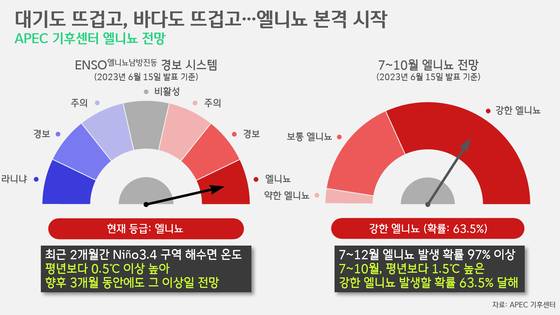 엘니뇨는 엘니뇨대로 심각해져 가고 있습니다. 이미 엘니뇨는 시작됐다고 봐도 무리가 아닙니다. “엘니뇨·라니냐 감시구역의 3개월 이동평균한 해수면 온도 편차가 0.5℃ 이상으로 5개월 이상 지속될 때, 그 첫 달을 엘니뇨의 시작으로 본다”는 것이 엘니뇨의 정의입니다. APEC 기후센터에 따르면, 이미 두 달 넘게 0.5℃ 이상인 상태가 이어져 왔고 이러한 상태는 향후 3개월 이상 이어질 전망입니다. 특히, 7~10월 중 '강한 엘니뇨'가 발생할 확률이 63.5%에 달한다는 것이 APEC 기후센터의 전망입니다.
