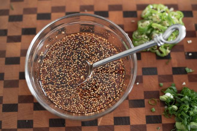 3. 두부가 구워지는 동안 양념장을 만든다. 간장, 고춧가루, 다진 마늘, 설탕, 참기름, 후추, 물을 섞어 준비한다.