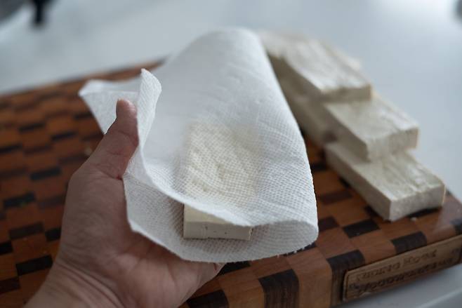 1. 두부는 1cm 두께로 썰어 키친타월로 겉면의 물기를 제거한다.