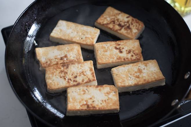 2. 팬에 기름을 두르고 중불에서 두부를 앞뒤로 노릇하게 굽는다. (겉은 바삭하고 속은 부드럽게 익는 것이 포인트)