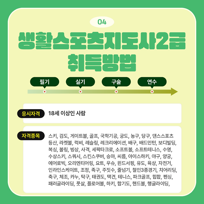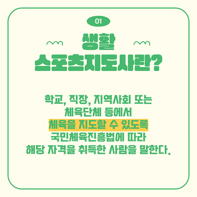 이 자격은 학교, 직장, 지역사회 또는 체육단체 등에서 체육을 지도할 수 있도록 국민체육진흥법에 따라 자격증 취득한 사람을 말해요.