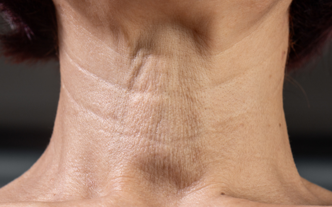 눈가는 주름이 얕고 얇게 생기는 반면, 목은 반복된 자세와 중력, 피부 처짐이 겹치면서 깊고 굵게 패이는 특징이 있습니다.