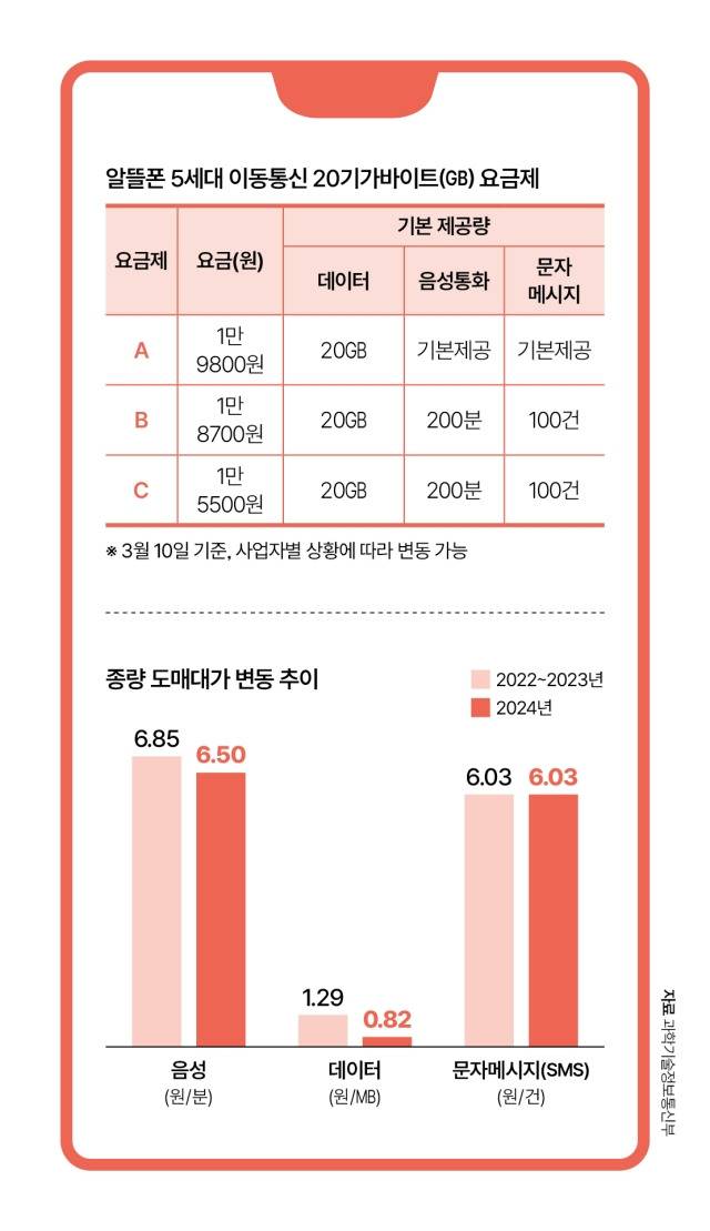 이에 따라 1메가바이트(MB)당 1.29원이었던 데이터 도매대가가 0.82원으로 36.4% 내려갔어요. 음성 도매대가는 1분당 6.85원에서 6.50원으로 5.1% 낮아졌고요. 이번 데이터 도매대가 인하 폭은 지난 10년 중 가장 큰 수준이에요. 이 때문에 알뜰폰사가 경쟁력 있는 1만 원대 5G 20GB 요금제를 내놓을 수 있게 된 거죠.