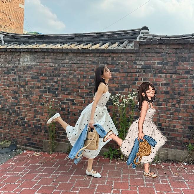 화이트 도트 원피스에 가벼운 점프 포즈, 기타를 머리 위로 번쩍 든 채 누운 모습까지, 장난기 넘치고 발랄한 표정이 픽셀 캐릭터에 그대로 복제돼 보는 이들의 미소를 자아낸다.