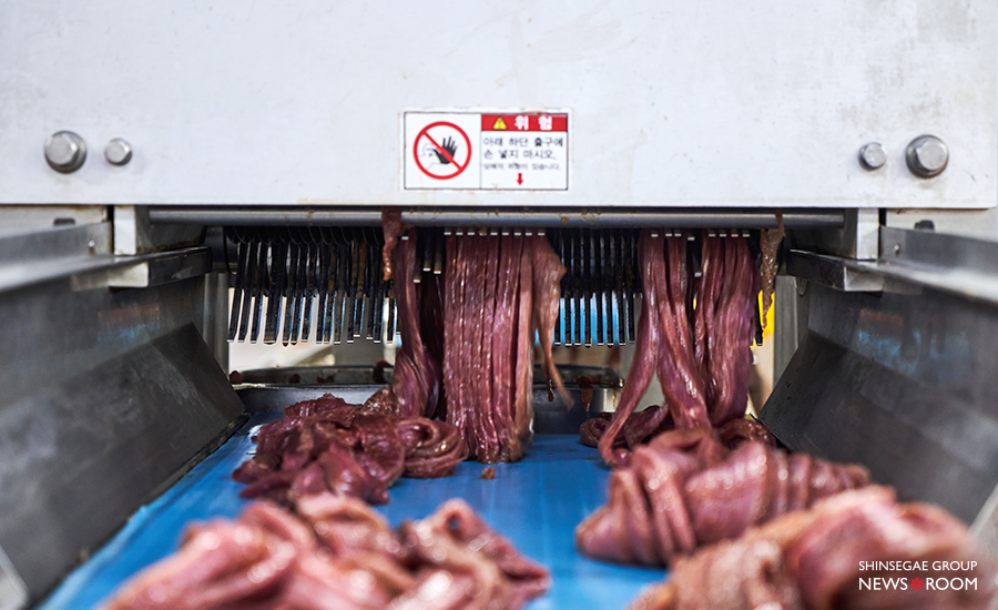 공장에 들어서자 가지런히 손질된 홍두깨살이 가장 먼저 눈에 띈다. 홍두깨살은 지방이 거의 없고 결이 일정해 육포 만들기에 최적의 원재료가 된다. 육포 제조의 첫 시작은 원료육을 세분화하는 것. 전문 작업자들이 정밀하게 손질해 일정한 크기와 두께를 확보한다.