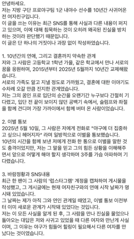 그러나 황영묵은 야구에 더 집중하고 싶다는 이유로 이별을 통보했고, 해당 여성은 갑작스러운 이별에 충격을 받은 상태에서 팬들의 오해를 방지하기 위해 글을 올렸다고 밝혔다. 바로 이 글이 커뮤니티를 뜨겁게 달궜다.