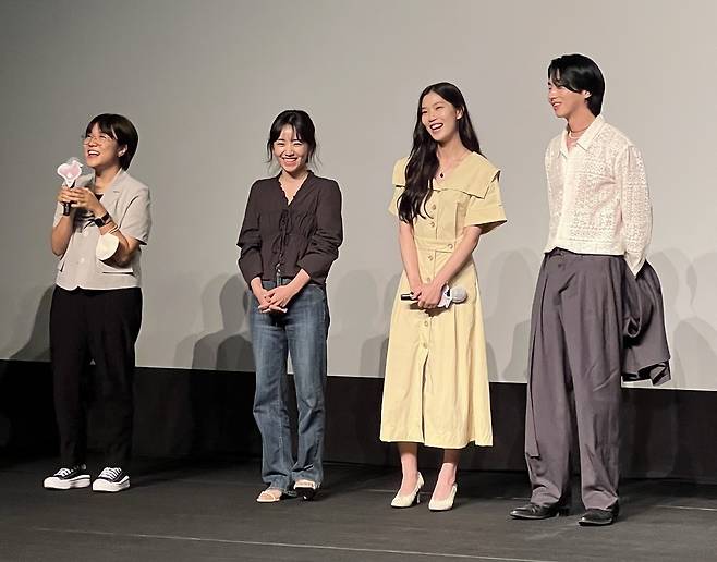 쿨한 매력으로 모두를 사로잡은 장재영의 절친 최유나 역의 송지오는 “오늘 영화를 보면서 최애 장면이 생겼다. 박서함 배우의 ‘피하지 말고 무시하지도 말고 그냥 느껴봐. 그럼 널 괴롭히던 혼란이 없어질지도 모르잖아’라는 대사를 듣는데 진심이 느껴져서 울컥했다”라며 영화에 대한 감상을 전했다. 또 “늘 영화가 끝나고 관객들이 나가면, 친구랑 무대 인사하는 연습을 했다. 꿈을 이룬 감격스러운 순간이다”라며 감사의 말도 잊지 않았다.