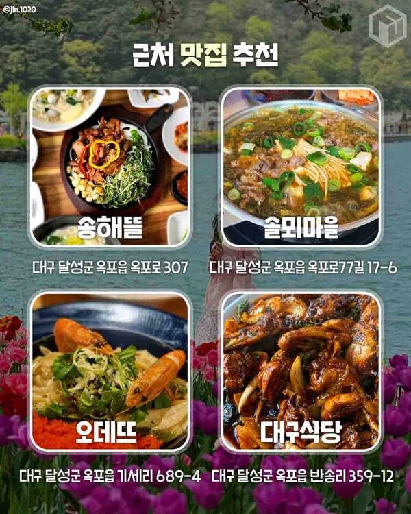 대구 달성군 옥포읍 옥포로 307에 위치한 '송해뜰' 과, 대구 달성군 옥포읍 옥포로77길 17-6에 위치한 '솔뫼마을', 대구 달성군 옥포읍 기세리 689-4에 위치한 '오데뜨', 그리고 대구 달성군 옥포읍 반송리 359-12에 위치한 '대구식당' 인데요. 이 4곳은 모두 대구 현지인 맛집으로 유명한 대구 송해공원 맛집이니 배 든든히 채우고 대구 옥연지 송해공원에 방문해보시길 추천드립니다.