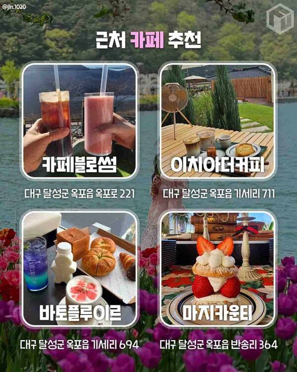 카페블로썸 ✅대구 달성군 옥포읍 옥포로 221 이치아더커피 ✅대구 달성군 옥포읍 기세리 711 바토플루이르 ✅대구 달성군 옥포읍 기세리 694 마지카운티 ✅대구 달성군 옥포읍 반송리 364
