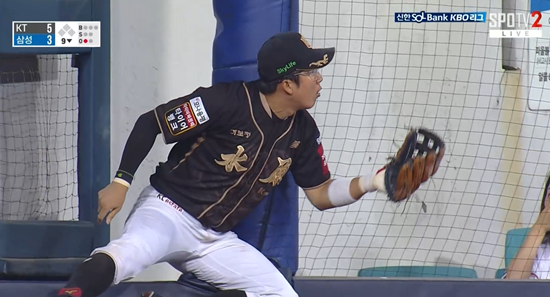 KT 마무리 박영현이 선두타자 김성윤 상대 2스트라이크 카운트에서 좌측 파울지역 높게 뜬 타구를 유도했다. 3루수 허경민이 김성윤의 타구를 쫓아가 살짝 점프하며 공을 잡았는데, 착지하는 과정에서 그라운드 바깥 익사이팅석과 연결되는 문에 몸을 부딪쳤다.