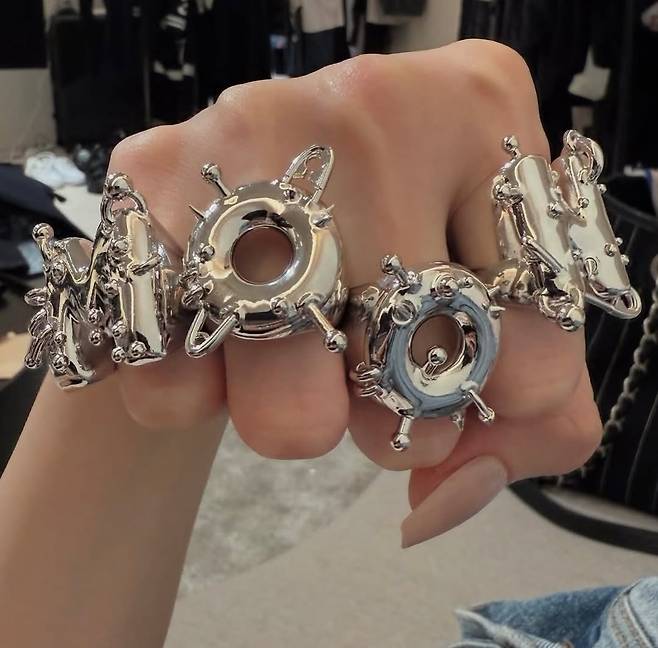 애니는 국내 디자이너 브랜드의 독창적인 주얼리를 적극적으로 활용하는 모습을 보여준다. 데뷔 당시 착용했던 ‘WICKED’ 로고 벨트와 ‘MOON’ 너클링은 국내 주얼리 디자이너 최지원과의 협업으로 만들어졌다. 메탈릭한 광택과 볼드한 폰트 디자인이 팀의 퍼포먼스 콘셉트와 맞물려, 걸크러시 무드에 미래적인 분위기를 동시에 전달한다. 이 아이템들은 오직 올데이프로젝트 멤버들을 위해 제작된 커스텀 피스다.