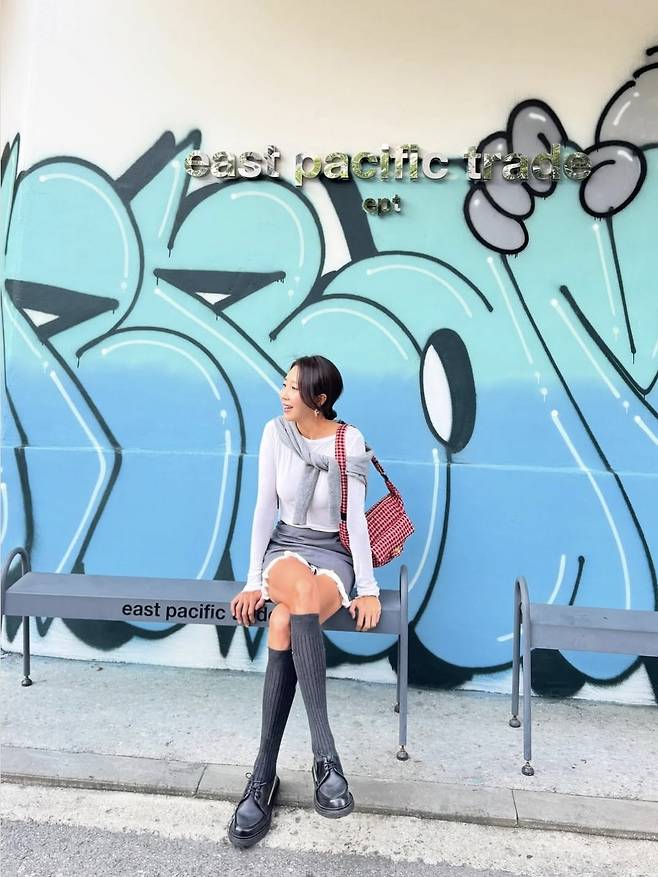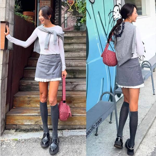 여기에 그레이 톤의 미니스커트와 니삭스, 그리고 캐주얼한 니트 매치를 더해 세련되면서도 발랄한 매력을 완성했습니다.
