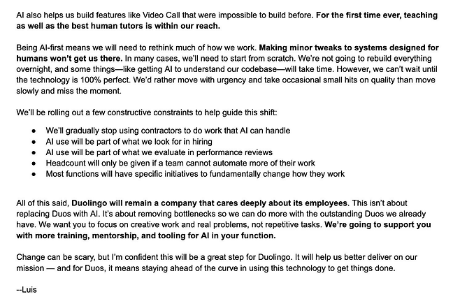 그는 "듀오링고는 직원들을 진심으로 아끼는 회사로 남을 것"이라며 "이번 변화는 듀오링고를 AI로 대체하는 것이 아니다. 직원들이 반복적인 업무가 아닌 창의적인 업무와 실질적인 문제에 집중할 수 있도록 병목 현상을 해소하는 것"이라고 설명했다.