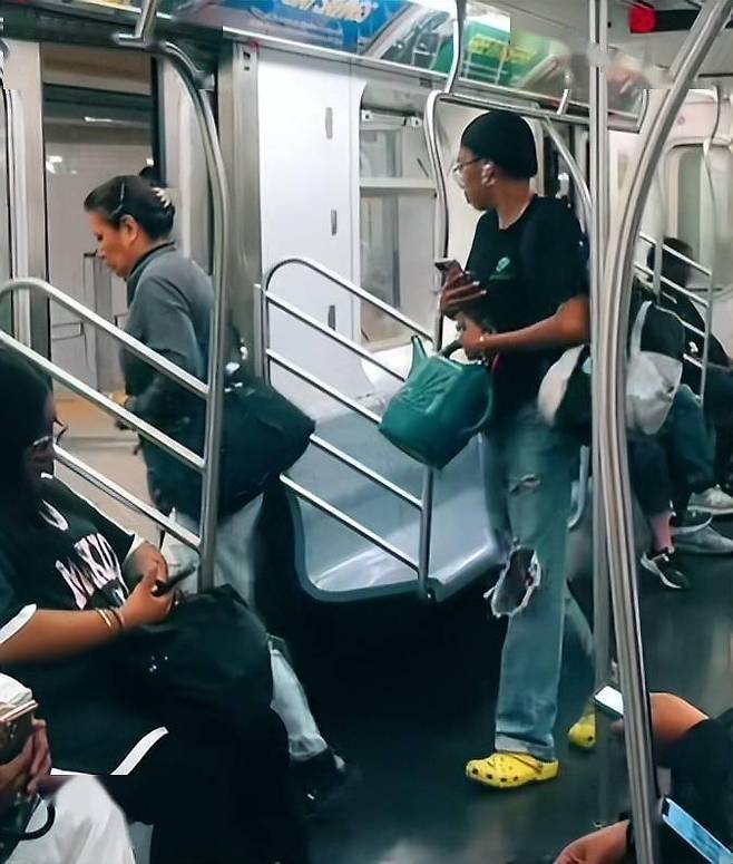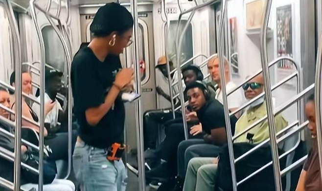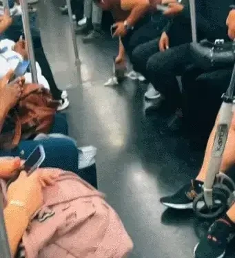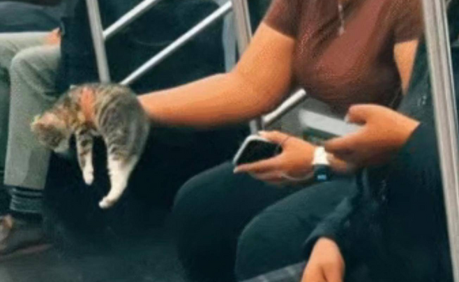 전철 안에서 고양이는 두려움에 떨며 이리저리 움직였고, 한 여성 승객이 그 모습을 발견하고 부드럽게 품에 안았습니다.