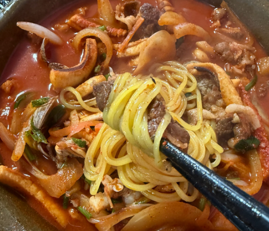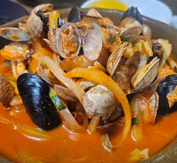 새우, 오징어, 홍합 등 해물이 들어간 얼큰한 국물 스타일입니다.