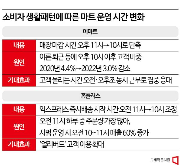 유통업계 관계자는 "대형마트는 채널별로 고객의 생활패턴 변화와 이에 따라 바뀌는 고객 요구에 따라 온·오프라인 서비스를 변화시키고 있다"며 "오프라인은 경험 콘텐츠를, 온라인은 쇼핑 편의와 빠른 속도를 갖추는 데 힘쓰면서 앞으로도 운영 효율을 위해 시간 등을 탄력적으로 적용할 것"이라고 말했다.